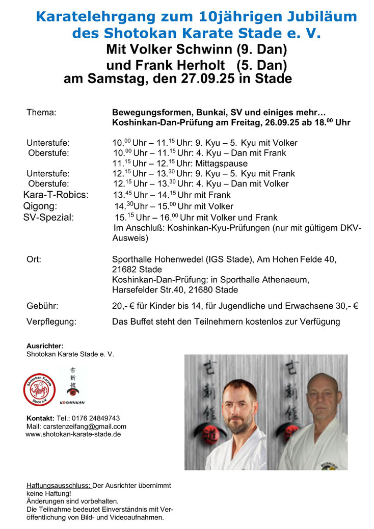 In letzter Zeit wurden oftmals neue zusätzliche Stilrichtungen wie Koshinkan empfohlen. Bei der diesjährigen Mitgliederversammlung am 21.03.2025 wurde beantragt und genehmigt, den Karatestil Koshinkan zum Shotokan Karate Stade e. V. hinzuzufügen... Infos zum Koshinkan findet man unter anderem hier: www.koshinkan.de